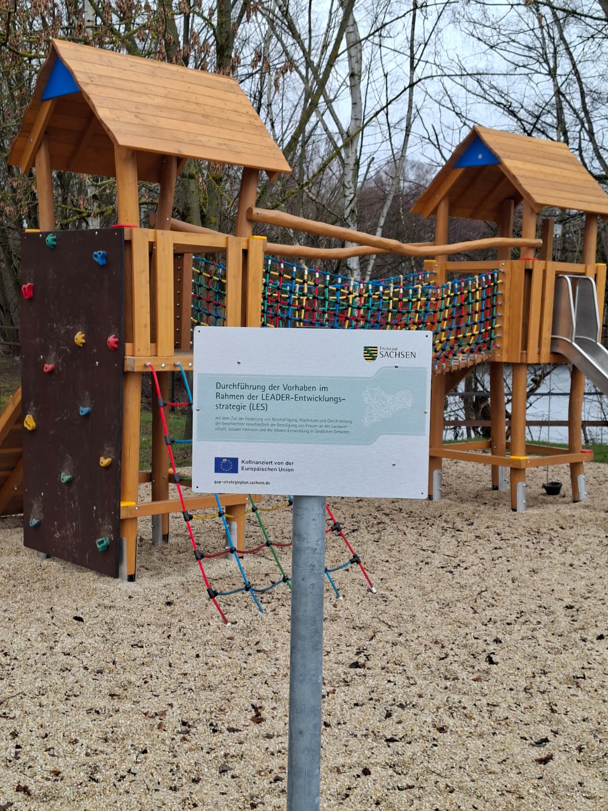 Die hier gezeigte Neugestaltung und Erweiterung des Spielplatzes wurde durch Steuermittel auf Grundlage des vom Sächsischen Landtag beschlossenen Haushaltes sowie durch die Europäische Union kofinanziert.